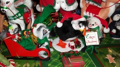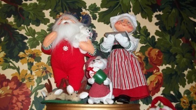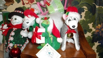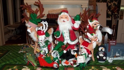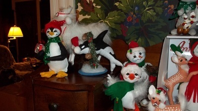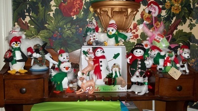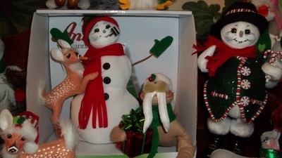 a small fraction of my Annalee Christmas collection Annalee: a line of felt dolls and animals with hand painted faces originally made in New Hampshire. Not to be confused with Annabelle, a creepy doll possessed by a demonic spirit.