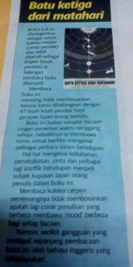 Ini pula buku kedua aku, Batu Ketiga Dari Matahari. Buku untuk homosapiens yang patah hati, stress berkerja dan mabuk dengan dunia sendiri. Buku ini ditulis oleh 8 orang penulis termasuk aku bergenrekan ketuhanan, cinta dan kemanusiaan. Setiap seorang penulis ada 6 cerpen sendiri.