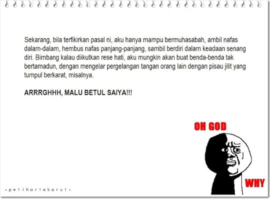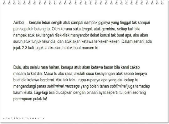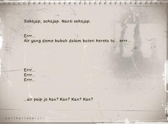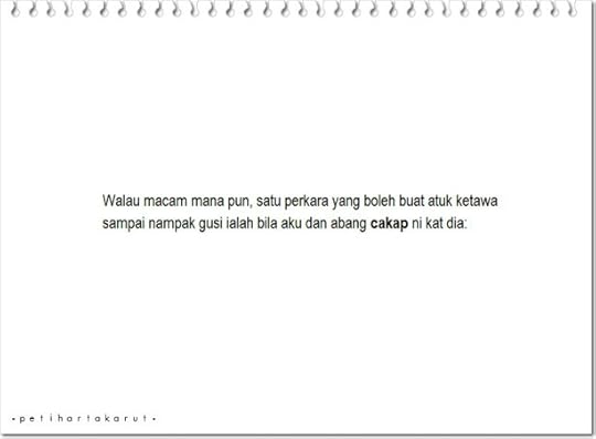 * Hai, kau. Aku ini ialah sedang mengalami kemuflisan idea dan kesibukan sekarang. Justeru, aku nak berehat seketika. Mungkin untuk sebulan dua. Tapinya, tapinya… aku dah suruh Bobby tolong tengok-tengokkan Peti ni. Kalau kau nak apa-apa, minta saja pada budak montel tu. Kalau dia tidur, tendang je. Ok?