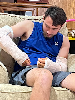 24 hours after my last post, I found myself on my way to the airport to take a one-way flight back to Dallas to take care of my son. Only minutes before I got up to give the devotional about praying Scriptures when we don't know how or what to pray, and then sending the ladies out on a prayer walk with Jehovah Ra'ah around our beautiful, peaceful campus while praying Psalm 23 over their lives, my son, David, flew over the handlebars of his mountain bike back in Texas and broke both of his forearms and dislocated both of his wrists. An ambulance took him to the nearest hospital, where they took him into surgery pretty quickly to put plates in both of his arms and pins in both of his wrists. I didn't get to hear at all from David before they took him into surgery, but Mike and I kept getting calls and texts from his friends or our friends whose kids are his friends telling us what to expect when he came out of surgery. He would NOT be able to go back to school for the rest of the semester.