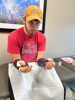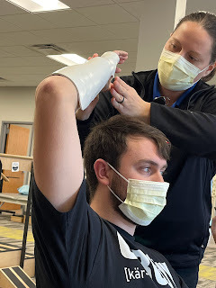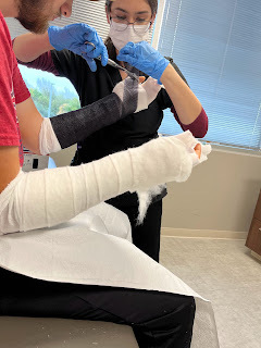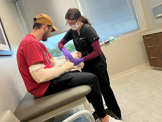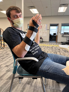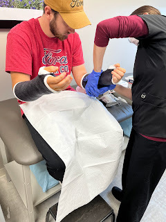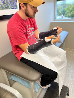 On another note, we were told David would need to see a new orthopedist three weeks after his last appointment in Texas, so we found one that specializes in sports injuries in Carmel, Indiana. We went on Wednesday of this week and were suprised to hear the new doctor wanted him out of casts and in splints instead. However, he wants to follow the last doc's instructions to keep the pins in his wrists for 8-10 weeks, so he's still got the pins in his wrists until the end of this month. He has more freedom now, for sure, but has to be more careful as he's not near as protected as he was in the casts. He still has to be very careful to not rotate his wrists or forearms in any way as long as the pins are still in.