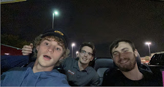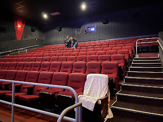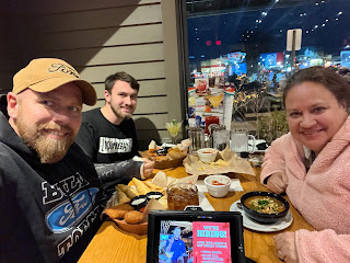 Sunday we went to church, went out to eat, went to storage to get our table and some cubbies to store our clothes, went to New Song to do laundry, and went to Matt and Chrissy's for dinner and to watch the Cowboys' game. Monday and Tuesday I took David to work with me, and Wednesday he went to work with Mike. Somehow he turned 21 overnight, so we went out for dinner at Chili's after work (while it snowed for his birthday), and then we went to see Black Panther--Wakonda Forever, a Marvel movie that had just come out a few days earlier. Surprisingly, it looked like we had the whole theater to ourselves (except for the 6 people that trickled in right before it started).
