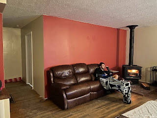 When I left, we had absolutely everything in the living room. Mike and I had been painting the spare bedroom so we could at least sleep and have our stuff in a more private location when people came over to help work on the house. We had two fireplace looking heaters that kept us pretty warm at night. We had plywood sitting on the counters for a makeshift countertop. The sink was hooked up enough to use with a 5 gallon bucket underneath, so you had to use the water sparingly and make sure you emptied the bucket outside often before it got too heavy and ended up splashing all over the place. We had a microwave, stove, and oven, but none were hooked up yet, so I did all my cooking with an electric skillet or a crockpot. The other two bedrooms were completely unusable and shut off at all times. The basement wall was 3/4 of the way done, probably. I will not say that I was at all disappointed to stay in a finished house for awhile in Texas.