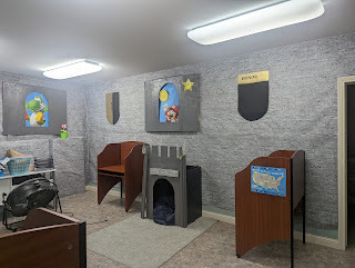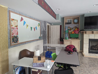Last year they all pitched in (houseparents included) to decorate it all like a castle with a Super Mario theme. They want to completely redo it all, though. I can't do anything until after NEXT week because there is another week of camp here that week, and they've got things all set up for camp right now. This week Bob and Lisa are taking some of the previous students on a trip to Michigan, so it will be quiet around here--a perfect opportunity for me to just get comfortable with my surroundings and start making myself at home. Interestingly, it already feels like home. Here are some pics of the classroom as it is right now.
