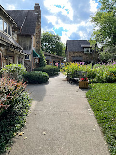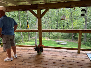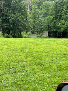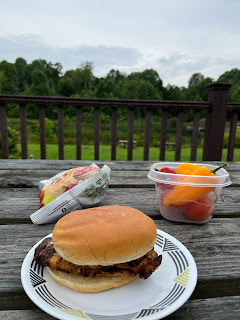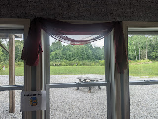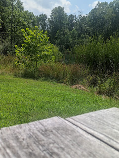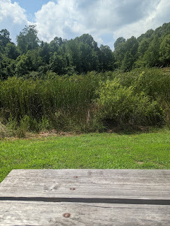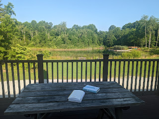 It's much easier to be still while sitting out here. I'm making it a point to try out all the different picnic tables and spots to sit, whether it be in my egg chair in front of the camper in the morning, at the picnic table right in front of the pond, the one on the deck on the other side of the pond that looks over toward the school house, or the one on the deck just outside the kitchen upstairs.