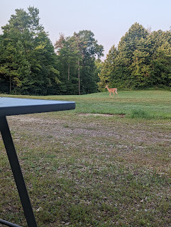 I've wanted to go camping with Mike for so long, and now here we are, literally camping every day for what will end up being two to three full months. Out in nature, where it couldn't be any more peaceful and quiet. With deer running around and visiting every day or so. With a campfire going every night that it's not raining. With a view of the stars that takes your breath away. Less than a ten minute walk down the gravel road to where I work five days a week. I literally don't have to leave the campus at all during the week if I don't want to. I'm free to go early to shower, and to use the laundry facilities in the evenings or on the weekends. Just a quick two minutes in the car. Sometimes when I'm out walking to and from work (when it's not raining), I stop dead in my tracks, take it all in, and remind myself that I really am living here. I may not have a home right now, but that school building/house sure does feel like home, like I was always meant to be there.