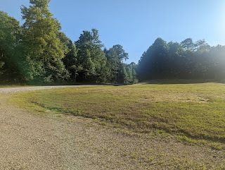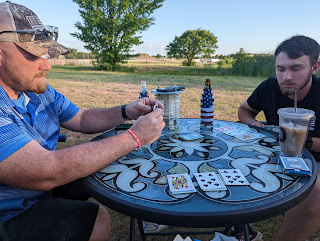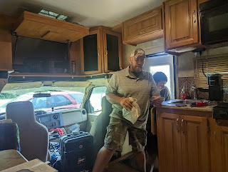 However, I skipped out on our first week to attend church together because I was exhausted. Mike met the rest of the family (including David) at church, and I stayed back to sleep. Then Mike and David stopped to get us some lunch before coming back to hang out in our new "home" for the rest of the rainy day. We sat and played cards and drank coffee and just enjoyed a quiet day. We ended the night cooking hot dogs on the stove and eating some chips and potato salad. Now that the rain has passed, I'm looking forward to Mike cooking for us in the evenings out on the grill and the smoker. Bob (my new boss) also said we could build a little firepit, so that will really make it feel like a long camping adventure.