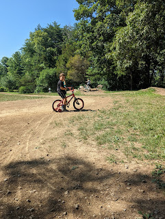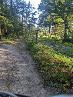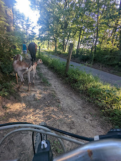Riding bike through a small patch of woods right beside the pasture on Matt's land. Following Chrissy and her horse, a little biker ahead, and two little goats. It's a whole different pace of life here. :)