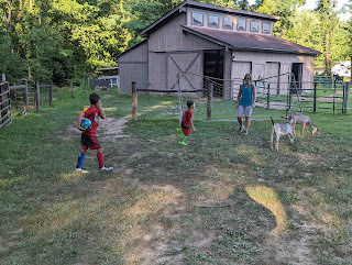 Every morning and evening in the summer means time out in the pasture, feeding the goats and a horse, while playing soccer, riding bikes, or riding four wheelers. Or even spraying Round-Up. LOL.