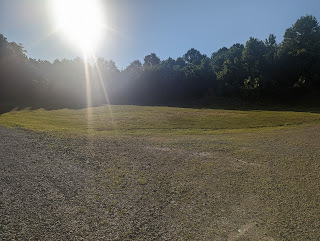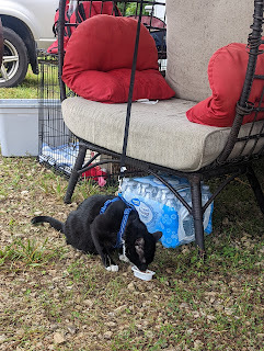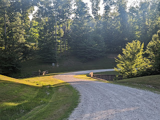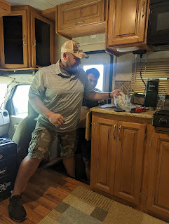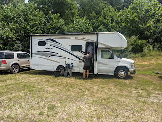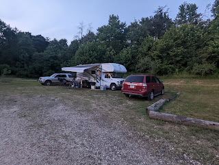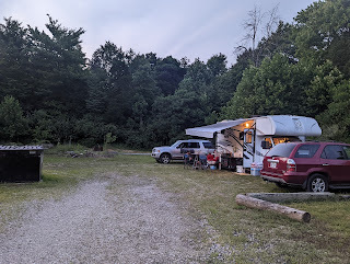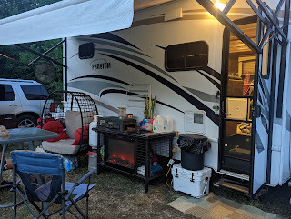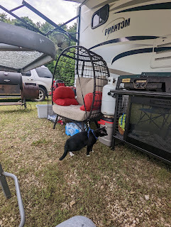 I think I got to bed a little before 1 a.m., only to be awakened by issues with my CPAP machine not being set up right, then two cats making a bunch of racket while RUNNING into our little bedroom because a storm freaked them out, then listening to a storm pound down on the camper and just imagining all of our camping chairs and things we left outside blowing all over the place. Somehow Mike slept through all of it, but I sure didn't. I think I slept about 2-3 hours total.