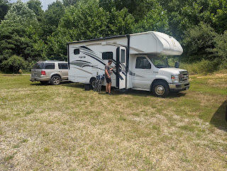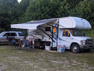 It literally took us the entire day to get set up, when you consider all the driving between Matt and Chrissy's house to New Song, hooking all the electric and water up, driving to town in Columbus (about a 25 minute drive from here) to eat lunch and then go shopping at Walmart to stock up on everything we'll need for at least a week or so, driving to Chrissy's mom's place to get some things out of storage, including more clothes, pots and pans, tools, and outdoor furniture, and then back to New Song. Then after we got all set up, we still had to drive 15 minutes to Matt and Chrissy's house to take David back since the camper only sleeps two. It was a late night for sure.