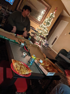 Traditional pizza after coming home from church before we exchange and open our gifts on Christmas Eve. (A tradition I grew up with as a child)