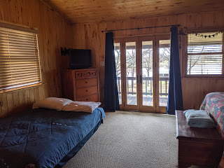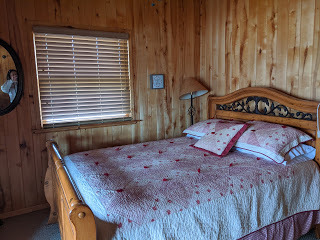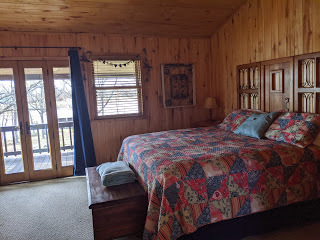 The master bedroom downstairs with access to the deck outside (I stayed in this room.)