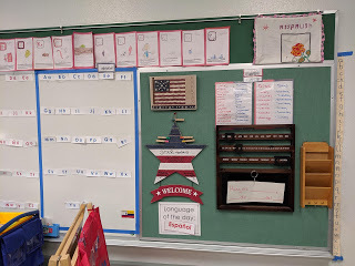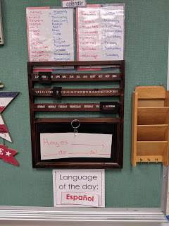 My new calendar that I found at Big Lots. The kids always struggle with the words before and after, so I am hoping that this linear type of calendar system will help them see what day/month/number came before and what comes after. They also really struggled last year to remember the difference in how to write the date in Spanish and in English, so I added a hanging date that they can flip back and forth from English to Spanish.