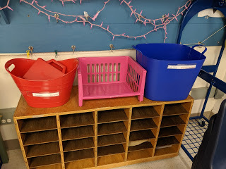 The red bin is another favorite center with magnets that they can build things with. The pink basket is where I toss all the graded papers and notes that the kids will file in the cubbies for me, and the blue basket is for my Math bags that I learned about in a training years ago that completely revolutionized how I taught Math. Last year I didn't have a chance to make them up, and I completely regretted that, too. So this year, we're making them the first week.