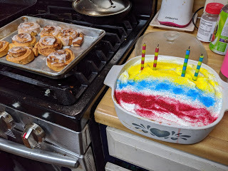The following week, we celebrated Juan's 22nd birthday with cinnamon rolls for breakfast and a jello cake that we didn't even get to try until the following day. His coworkers showered him with celebration all day long and an old classmate made him a cake. We all headed to church events that evening, so we celebrated with a family dinner out at Chili's the next night, grandparents included. :)