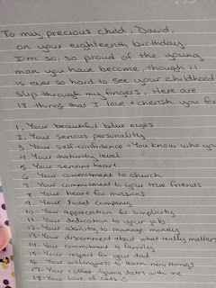 The following week, we went out as a family again to celebrate David's 18th birthday a couple days early. As intentional as I've always tried to be with this child, somehow I clearly see his childhood slipping right through my fingers. I'm so incredibly proud of the young man he has become. I find myself holding on tight to every moment I have left with him still living at home and living on the same school calendar as me. I wait up on the couch for him when he works late, I take him out for coffee on the weekends whenever he's not working, I actually buy all the extra things he throws in the cart at the grocery store just because I'm thrilled that he went to the store with me. The deck of Skipbo cards is never far from reach so we can always play a quick game or two whenever we find a few moments where we're not all headed in different directions.