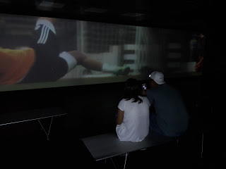 Where the players sit. It's dark in the picture, but Juan David and Laura are sitting there together on the players' chairs.
