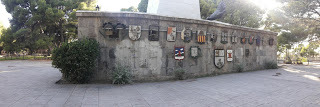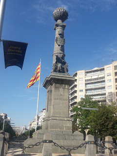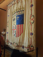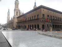 The wind didn't cooperate, but there are four flags. First, the flag of Zaragoza. Second the flag of Spain. Third, the flag of Aragon. Fourth, the flag of Europe. You saw all four of these flags hanging together often.