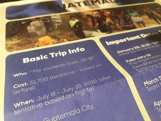 Let me back up a little bit here to explain. Right before Shane, our previous Student Ministries Pastor, left to serve as the High School Pastor at the main campus, he pulled Juan aside to tell him about an upcoming mission trip he's leading to Guatemala this summer. It will be the first time our church will take a group there, so they are purposely keeping the group small. But he specifically chose Juan to be a part of it. It was completely unexpected, but the more we thought about it, we realized this would be a great way to continue bonding with this Pastor, letting him continue to invest spiritually in our son. So we said as long as the dates worked out, we'd like for him to go.