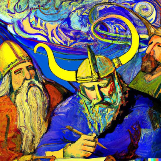 Illustration: DALL-E by RHL, ‘Rumi, Odin and Edward Lear are writing poetry to question the universe’
