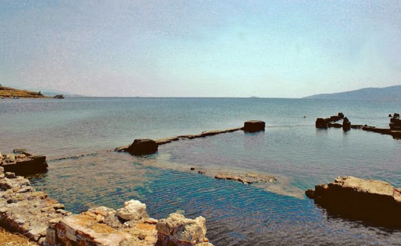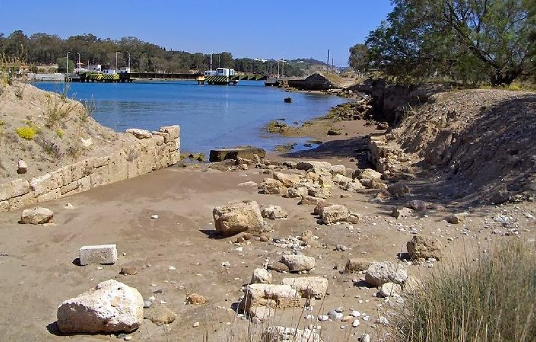 The following photo shows the ruins of the diolkos at the Lechaeon harbor on the west. . (Attribution: By Dan Diffendale [CC-BY-SA-2.0 (http://creativecommons.org/licenses/b...)], via Wikimedia Commons)