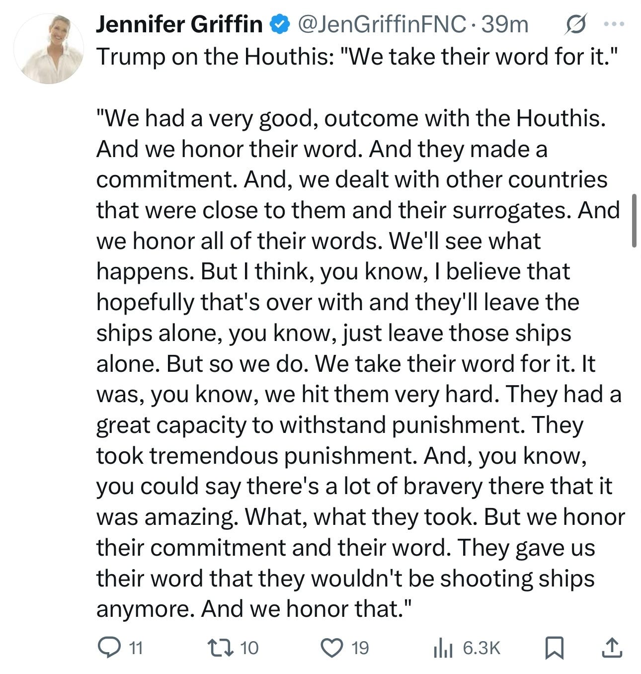 Timestamp: (3:51). More information has come out on why President Trump stopped bombing the Houthi’s in Yemen.