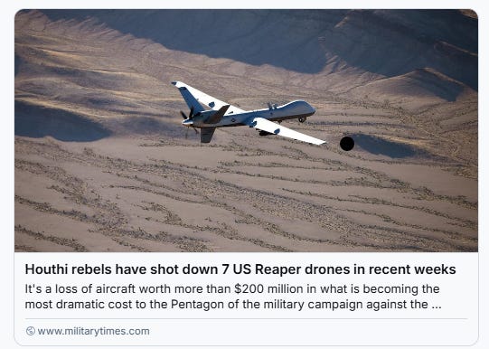 Back to the cost of this to date, besides losing the fighter jet mentioned above, the Houthis continue to knock out MQ-9 Reaper drones. They’ve now downed seven of them in the past month and a half.