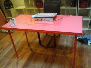 I ordered some table legs from Home Depot and purchased some paint, a 2 x 4 foot mdf board and some 2 X 1 inch poplar and with a drill, some paint, and a grumbling hubby have a ridiculous hot desk: