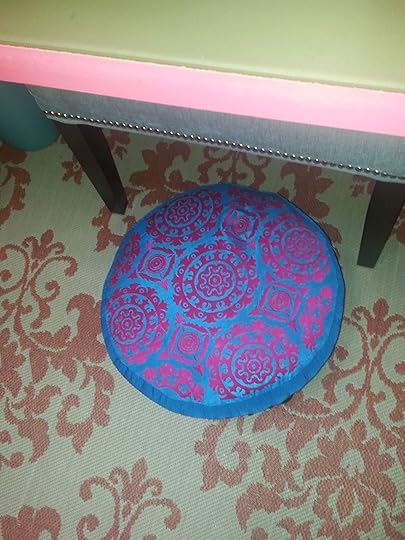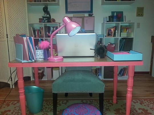 My Book Shelves: Acquired over the years from multiple sources; Target, Walmart, Kmart. I painted them all one unifying color (turquise) and added trim (Home Depot) on the sides to make them look like one piece. I used the same pink paint from the desk to pain the inside backing of the shelves. On the center shelf I used wrapping paper found on sale at Home Goods as wallpaper to mix things up a bit. The shelves behind my desk are Closet Maid shelves in white I purchased a few years ago and were in varying rooms of the house before I placed them in the office for additional storage.