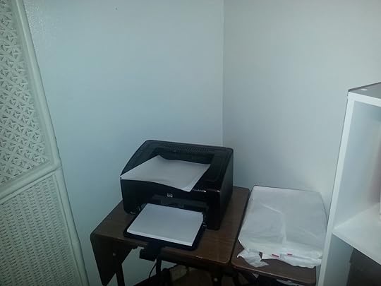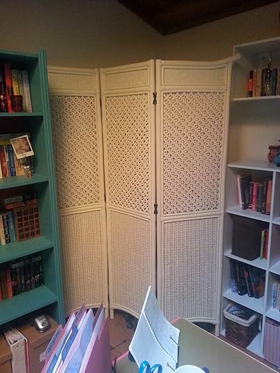 My Printing Nook: A dividing screen on sale at Pier One and an old folding typing desk. I hate seeing electronics liter my office. Since my desk doesn't have any cubbies, I placed my printer and recycle bin in a corner of the room and hid them from view using the screen. I purchased the screen a few years ago during one of Pier1's rare sales were prices are actually affordable and not laughable. It didn't really fit in with the decor of the new house so I re-purposed it. I'm still debating on whether I should paint the screen. But for now it remains in its original white.