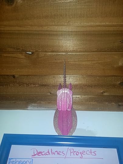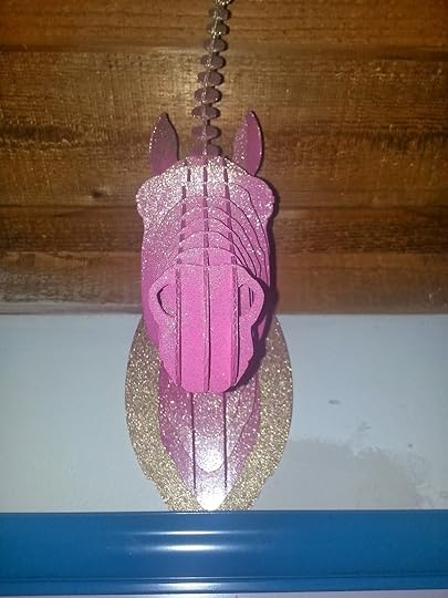 My Unicorn: Uncommon Goods. Yes I have a unicorn ans I spray painted it pink with gold glitter. Why? Because my muse demanded it :) It hangs behind my desk and amuses me to no end.