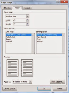 Keep the margins at .75″ except the outside margin, which is set at .5 to give you a little more room towards the outside edge. Set Multiple pages to “mirror margins”. This means that the left gutter ‘mirrors’ the right gutter when the book is printed. Now that the margins are set, click the Paper tab. We are working on a 6×9 size paperback so we will set the paper size to “custom” and the Width to 6″ and Height to 9″. Easy peasy, lol.