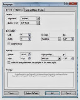 Now, how do we get those perfect chapter headings and white space we see in every nicely formatted book? Your chapter header should start a few lines down from the top, and you should also use a bold font. You could hit enter a few times but what a pain in the you-know-what. Go to your first chapter heading and right-click on the text and choose the “Paragraph” option. You should see this box: