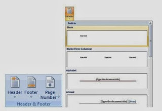 To set up a header and footer for your document, click on the Insert tab at the top of Word. Now locate the Header & Footer panel. Click on the Header item and you'll see a drop down list appear: