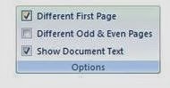 A new tab appears called the Design tab. The panels on the tab are: Header & Footer, Insert, Navigation, Options, Position, and Close.The thin, dashed blue line is the bottom of your header, and everything above is the area where you can type your header text. There is already a selected area with the words "Type text" in it but this is the first page in the story. You don't want a header on the first page. We want the headers to start on page two. Look at the Design tab, and locate the Options panel. Check box next to Different First Page: