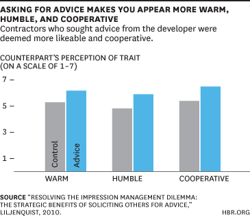 1. Advisors will like you more: Arthur Helps sagely observed, “We all admire the wisdom of people who come to us for advice.” Being asked for advice is inherently flattering because it’s an implicit endorsement of our opinions, values, and expertise. Furthermore, it works equally well up and down the hierarchy — subordinates are delighted and empowered by requests for their insights, and superiors appreciate the deference to their authority and experience. James Pennebaker’s research shows that if you want your peers to like you, ask them questions and let them experience the “joy of talking.” This is especially important because research shows that increasing your likability will do more for your career than slightly increasing competence.
