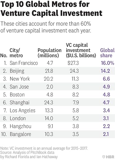The third shift is the Great Urbanization of startup activity and venture capital activity in the largest global cities in the world. For decades, startups and venture capital activity was located in the quaint suburban office parks and low-rise office buildings of “nerdistans” like Silicon Valley, the Route 128 Beltway outside Boston, and the suburbs of Seattle, Austin, or the North Carolina Research Triangle. But our research shows that the startup activity and venture capital investment are now concentrated in some of the world’s largest mega-cities.