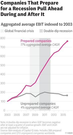 The current economic expansion is long by historical standards, and thus the risk of recession rises with each passing month. Recessions catch many companies by surprise, with predictable results. In the 2001 recession, total sales for the S&P 500 declined by 9% from its pre-recession peak to its trough 18 months later—almost a year after the recession officially ended. But these periods also present opportunities for well-prepared companies to take advantage of the turmoil and gain share.