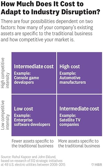 Companies in Quadrant 4 are well positioned to embrace disruption. A case in point is Microsoft, which—drawing on many of its existing assets in software development, customer relationships, and networking technologies—has embraced a shift from on-premise software licensing to cloud-based software and infrastructure services, where it faces low competitive intensity within the enterprise market.