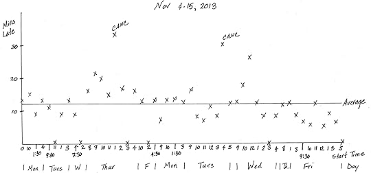 The first is learning to think like a data scientist. We don’t speak about this often enough, but it is really hard to acquire good data, analyze it properly, follow the clues those analyses offer, explore the implications, and present results in a fair, compelling way. This is the essence of data science. You can’t read about this in a book — you simply have to experience the work to appreciate it. To give your team some hands-on practice, charge them with selecting a topic of their own interest (such as “whether meetings start on time”) and then have them complete the exercise described in this article. The first step will lead to a picture similar to the one below, and the rest of the exercise involves exploring the implications of that picture.