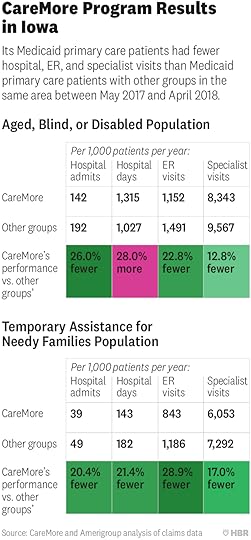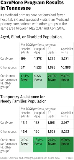 Our results. In Tennessee and Iowa, CareMore has delivered outcomes that have significantly improved care and reduced its cost. From May 2017 to April 2018, CareMore’s Medicaid patients in Tennessee experienced 10% to 17% fewer days in the hospital, 21% to 22% fewer ER visits, and 23% to 28% fewer specialist visits than other Medicaid managed care beneficiaries in the same geography, across Medicaid eligibility categories.