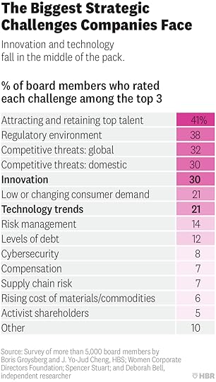 We found that concerns about innovation fall behind other issues for most directors. Fewer than one-third (30%) of respondents to our survey see innovation as one of the top three challenges their company faces in achieving its strategic objectives, and just 21% think that technology trends are a major strategic challenge. Innovation ranks fifth, after more-conventional concerns such as attracting and retaining top talent and the regulatory environment.