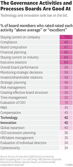 The effectiveness of board processes for supporting innovation is also positively correlated with overall board performance. In other words, the boards with strong innovation processes tend to be the ones that are performing well on all fronts.