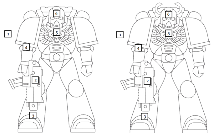 If an opponent suffers damage / injury to every location on their power armoured form, including their weapon (locations 2, 3, 4, 5 and 6) then it is considered that the Space Marine's plate and enhanced physicality can take no more. Smoking and bolt-riddled, they fall and the last Space Marine standing is declared the winner of the game. Naturally, legionary advantages might have to be taken into account in respect to this (for example, the elimination of hit outcomes).