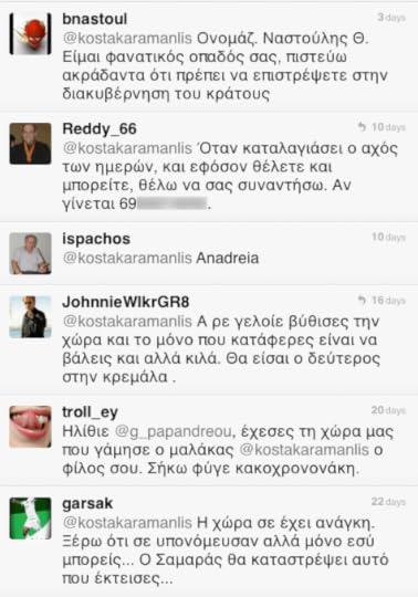 Το @kostakaramanlis ήταν ένα πείραμα με αφορμή ένα άρθρο που έπρεπε να γράψω σε μηνιαίο περιοδικό, και μετά συνεχίστηκε για λίγες εβδομάδες, πίσω, στο μακρινό 2009. Έκτοτε έχει μείνει εκεί έξω, ανενεργό (και βέβαια με το link στο bio που εξηγεί περί τίνος πρόκειται) αλλά κοίτα να δεις: Παρ’ όλο που έχουν περάσει δυόμισι χρόνια, κόσμος εξακολουθεί να πιστεύει ότι είναι πραγματικό account του πρώην πρωθυπουργού. Και να γράφει διάφορα. Ας πούμε, το τελευταίο 20ήμερο: