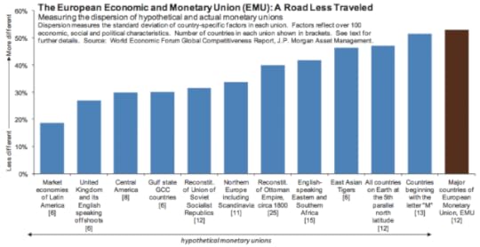 Λοιπόν, βλέπεις αυτές τις μπάρες; Δείχνουν τυχαίες και εικονικές συμμαχίες τυχαίων κρατών. Η κάθε μπάρα σχηματίζεται ανάλογα με το πόσο συμβατές είναι οι οικονομίες των συγκεκριμένων χωρών μεταξύ τους, σύμφωνα με τους σημαντικότερους οικονομικούς δείκτες. Όσο μικρότερη η μπάρα, τόσο πιο συμπαγής η ομάδα. Οι καπιταλιστικές χώρες της Λατινικής Αμερικής, ας πούμε, είναι η πιο συμπαγής ομάδα απ’ όλες. Η χώρες της Βόρειας Ευρώπης είναι περίπου στη μέση. Οι 25 χώρες που αποτελούσαν την Οθωμανική Αυτοκρατορία το 1800 είναι λίγο παρακάτω. Ποια είναι η τελευταία, η πιο ασύνδετη ομάδα, με τα πιο ασύμβατα μέλη; Η Ευρωπαϊκή Νομισματική Ένωση. Ναι. Αν πάρεις τυχαία τις χώρες που αρχίζουν από «Μ» και τις μαζέψεις και τους βάλεις κοινό νόμισμα, λέει, πιο πιθανό είναι να πετύχει.