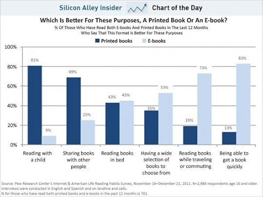 Ας δούμε τώρα κάποια ενδιαφέροντα πράγματα για το θέμα «βιβλίο». Στο πρώτο διάγραμμα (via) βλέπουμε τις απόψεις των Αμερικανών για το τι είναι καλύτερο, τα παραδοσιακά χάρτινα βιβλία ή τα e-books, σε έξι διαφορετικά σενάρια. Επίσης ενδιαφέρον: Ένας στους πέντε Αμερικανούς δηλώνει πως έχει διαβάσει e-books. ΕΝΑΣ ΣΤΟΥΣ ΠΕΝΤΕ.