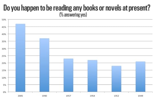 Πράγμα που μας φέρνει στο δεύτερο και σημαντικότερο διάγραμμα (via), που δείχνει πόσοι Αμερικανοί δηλώνουν πως διαβάζουν ένα βιβλίο τώρα που μιλάμε. Το συμπέρασμα είναι προφανές, αναμενόμενο για εμένα, αλλά είμαι σίγουρος ότι αποτελεί έκπληξη για πολλούς: Ποτέ στην σύγχρονη ιστορία οι άνθρωποι δεν διάβαζαν περισσότερα βιβλία.