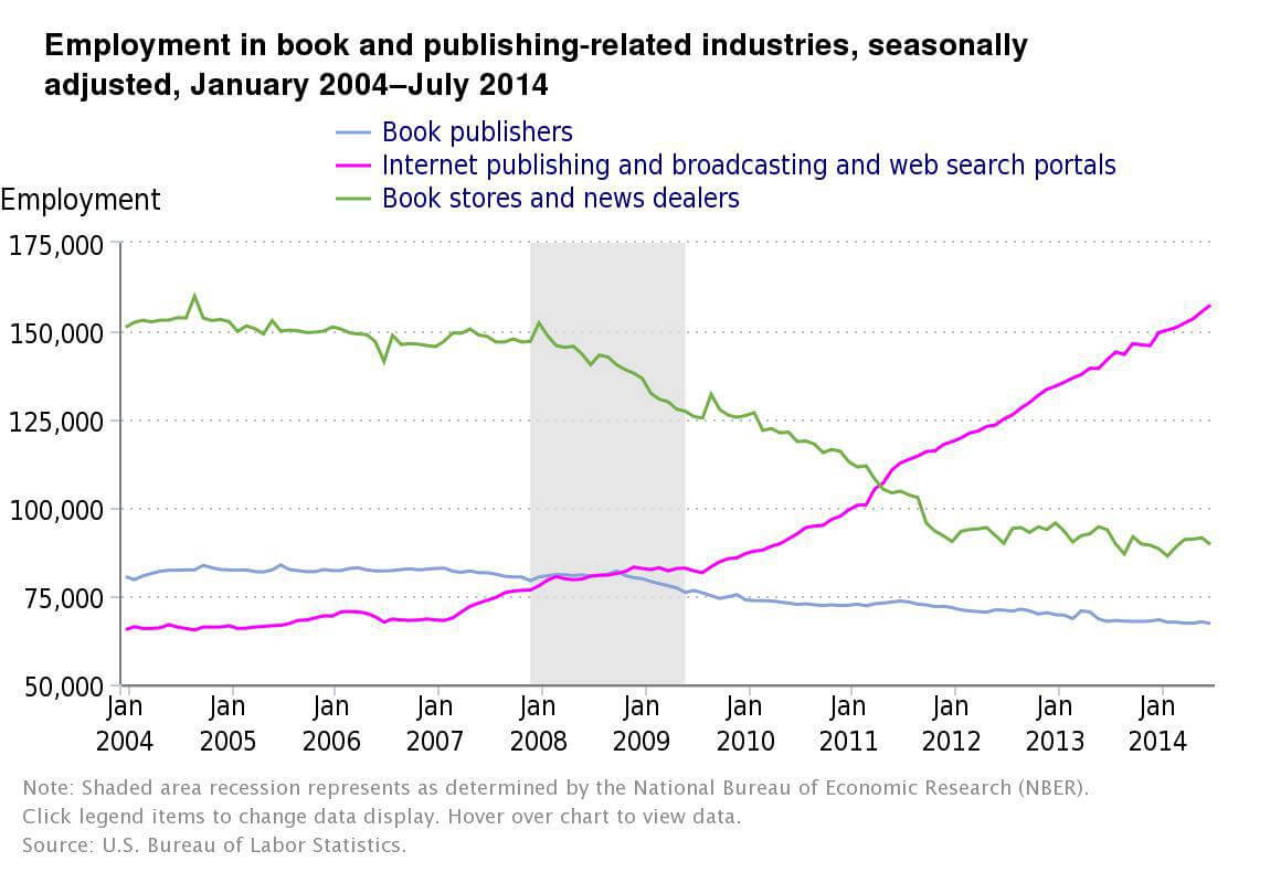 Εδώ βλέπουμε τη ραγδαία μείωση του αριθμού των εργαζομένων σε βιβλιοπωλεία, τη σημαντική μείωση του αριθμού των εργαζομένων σε εκδοτικούς οίκους, και τη ραγδαία αύξηση στον αριθμό των εργαζομένων σε online εκδόσεις.